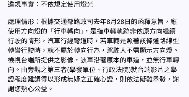 線型道路定義,所以仍然可以不打方向燈,狠狠打了警察和交裁所的臉,最終撤銷罰單。