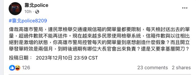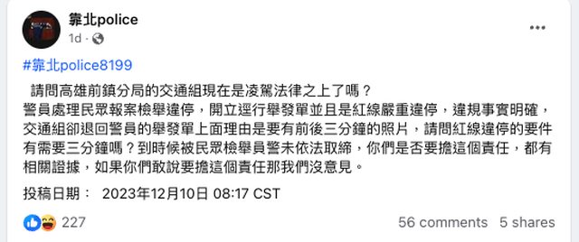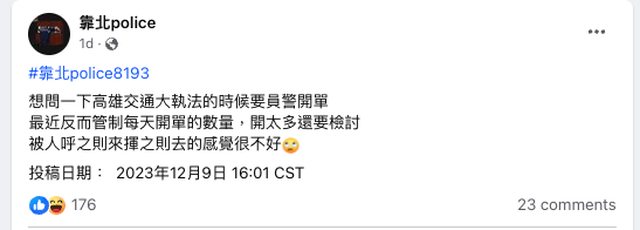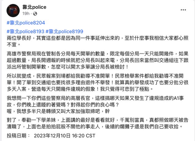 : 多篇靠北police的文章談到高雄警局限制民眾檢舉的案件