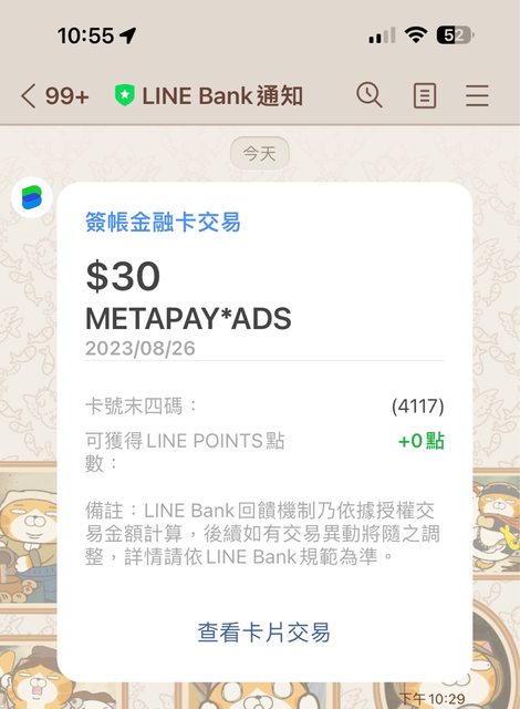 → Vistorieaz : 給銀行問問,結果幾個小時後被連刷4筆1200點FACEBK 08/27 11:49