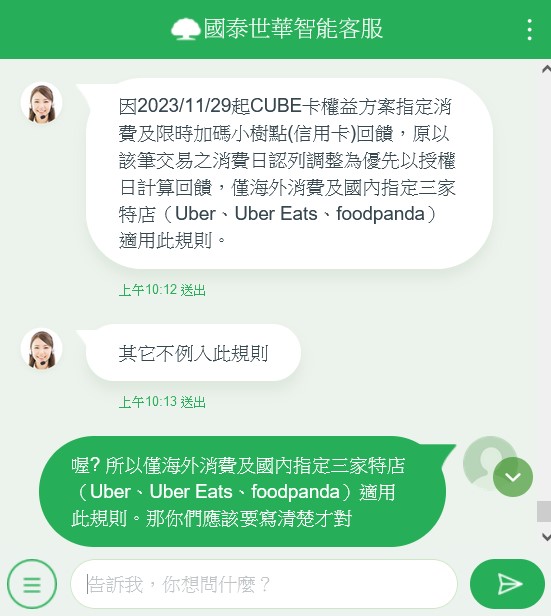 親愛的客戶您好: 自2023/11/29起,小樹點(信用卡)回饋加碼適用日期,原以該筆消費之消費日判定,調整為 優先以授權日為適用日期,詳細說明如下: CUBE卡於每筆消費請款入帳後,依該筆消費之授權日判斷適用權益方案、符合之限時回饋加 碼,若無授權日再以「消費日」認列,以各別回饋率計算小樹點(信用卡)並依小數點第一位 四捨五入至整數位,並於次二日(遇假日順延)回饋至正卡人信用卡帳戶,實際回饋時間依本 行作業時間為準。 國泰世華銀行 敬上 https://reurl.cc/dmWg9V 情報來源 -- ※ 發信站: 批踢踢實業坊(pttbestweb.org.tw), 來自: 59.127.156.168 (臺灣) ※ 文章網址: https://pttbestweb.org.tw/creditcard/M.1695647651.A.925