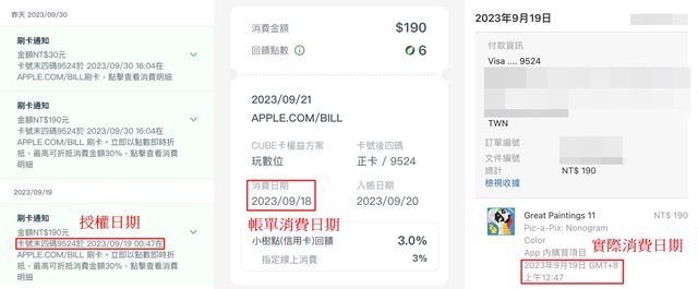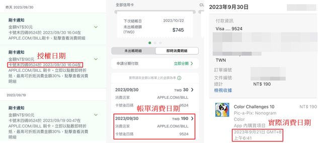 其中授權日期=帳單消費日期=9/30 但實際的消費日期是9/21 9/19 https://i.imgur.com/GVoWRkm.jpg