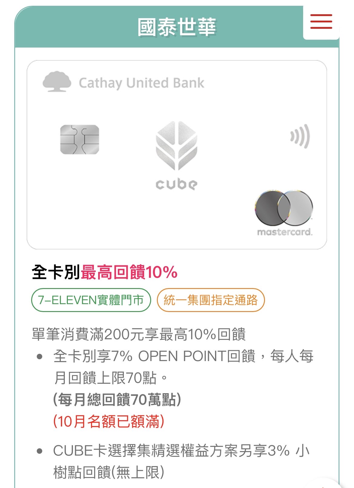 今年第四季Cube7-11/OP錢包10%還有,全家的還出現不知道是不是GG惹 https://bit.ly/3LITATv 一樣是3%集精選小樹點+7%OP點(需單筆滿200) 後者上限縮水成70點OP/每月(即時贈點) 然後原本每月搶登錄取消改成每月限量70萬點,額滿會公告… 越改越爛,看來花椰菜不想玩了? -- ※ 發信站: 批踢踢實業坊(pttbestweb.org.tw), 來自: 101.9.199.108 (臺灣) ※ 文章網址: https://pttbestweb.org.tw/creditcard/M.1696209985.A.902