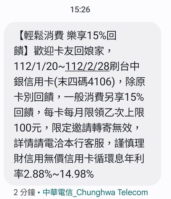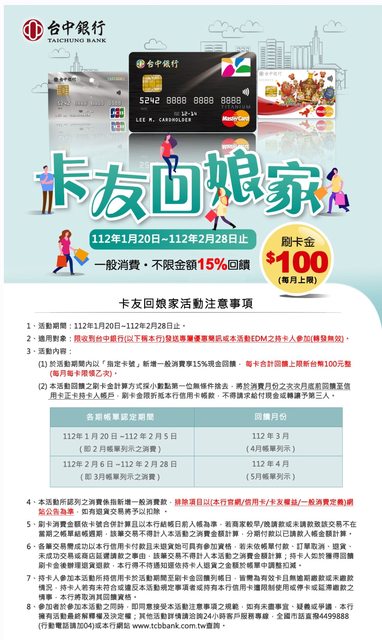 標題Re: [閒聊] (分眾)台中商銀樂享15%,100*2月