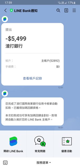 → kkkk1234 : 渣打不能主動繳費避免自動扣款嗎 我的聯邦第一期消 11/29 17:36