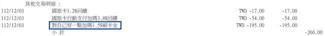 小弟看到這個月的兆豐國旅卡帳單上,多了一個「對自己好一點」加碼回饋1.5%刷卡金: