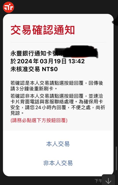 推 SS003805 : 永豐不意外 我之前卡片還躺在郵局代領就被盜刷了。 03/20 16:26