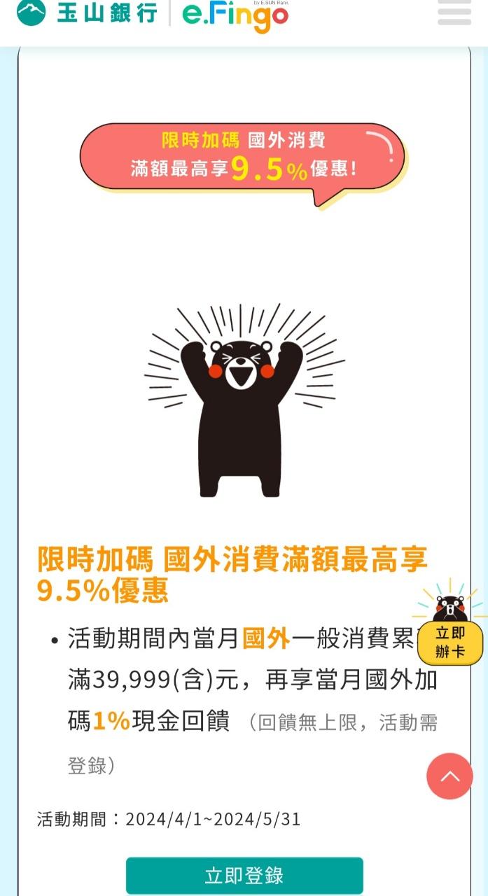→ catuncle1 : 其實很多人盲目辦熊本熊雙幣卡,主要就是看到那1.5% 04/16 22:23
