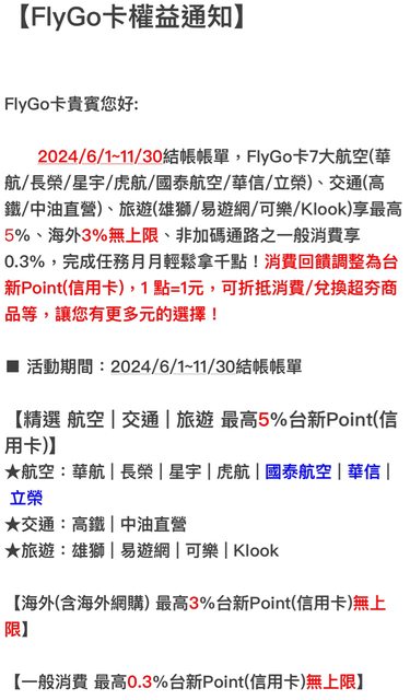 標題[情報] 台新FlyGo 6/1-11/30新權益