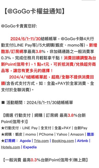 標題[情報] 台新@GoGo 6/1-11/30新權益