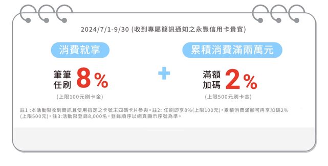推 biojo : 今天又收到另一張卡簡訊 不太一樣 任刷8%回饋上限1 07/08 15:46