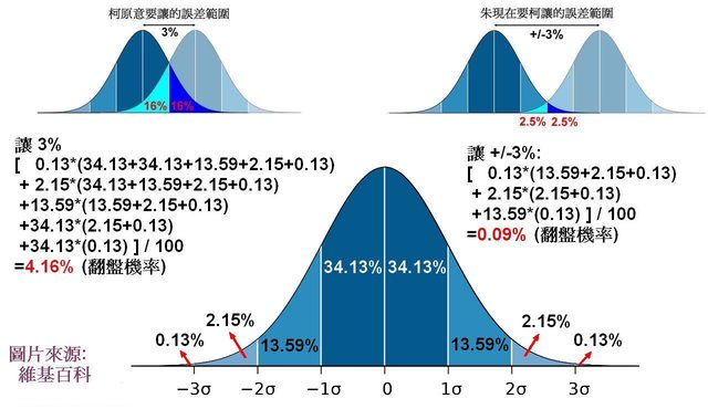 小弟非統計專業,試著用一張圖簡單試算統計數據中,3%與+/-3%的差別。 在此跟大家請教,不知小弟的算法是否正確?若有錯誤歡迎指正。 (當然,切得越細就能再算得更精確,但那就跳到微積分的範圍,比較不適合一般大眾討論。) 假如小弟的算法沒有太大錯誤,從推算出的翻盤機率,可以看出+/-3%已經不是一般人能接受為“可能發生”的機率 (小於千分之一)。 註:原使用之常態分佈圖出自於維基百科,圖上已有標示,若有侵權疑慮麻煩告知,確認後儘快刪除。 http://i.imgur.com/luDyrn4.jpg