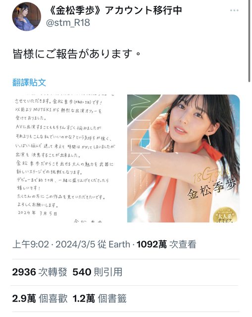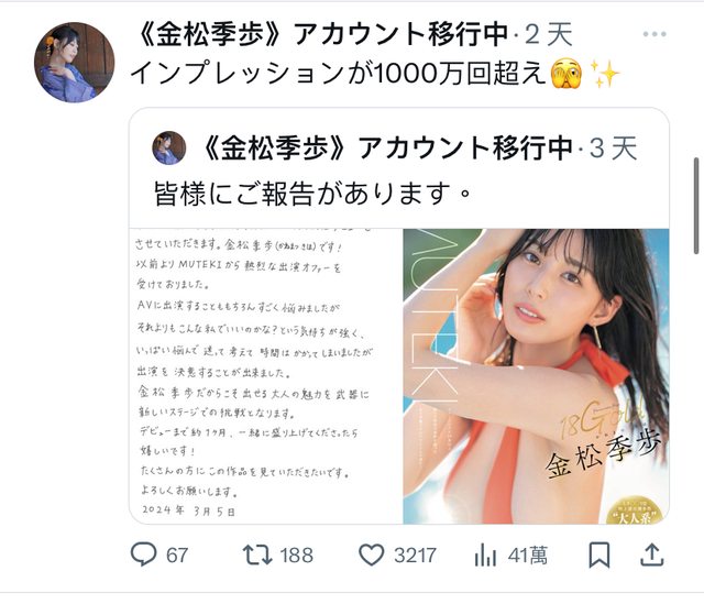 話說她出道文觸及率來到猛猛的1100萬人次