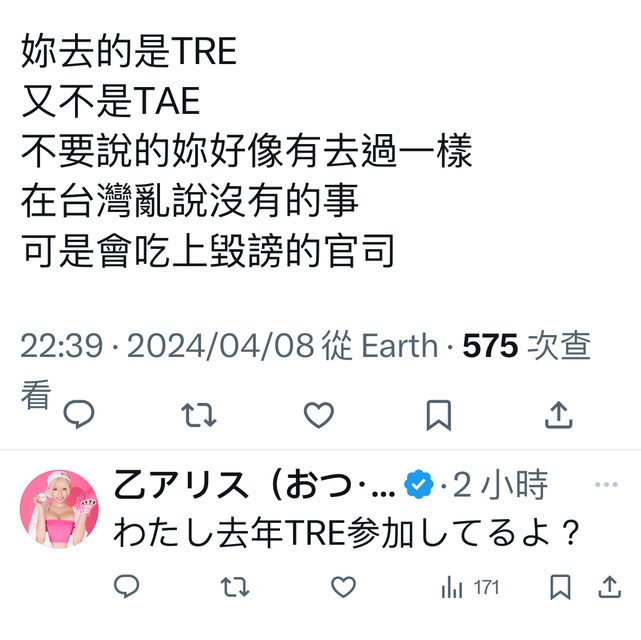 網友說你參加的是TRE 不是TAE 不要沒去過還對活動指指點點 乙愛麗絲卻很理直氣壯的說我參加過TRE喔 所以根據現在參加過TAE的女優紛紛抱怨的情況下 劍大的文章內容算是被打臉了吧? -- ※ 發信站: 批踢踢實業坊(pttbestweb.org.tw), 來自: 122.99.25.54 (臺灣) ※ 文章網址: https://pttbestweb.org.tw/japanavgirls/M.1712613190.A.4EB
