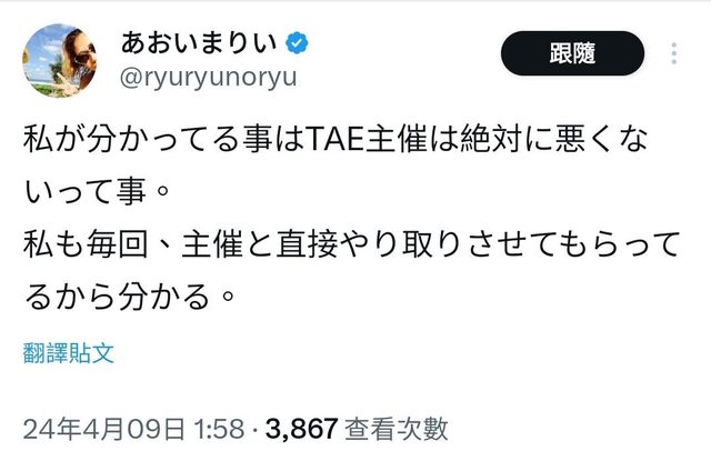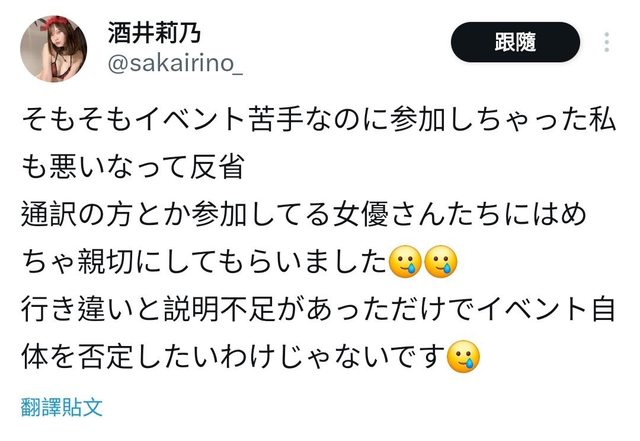 她也說她不擅長這種event,答應參加的自己也要反省 雖然是有跟行前說明不同或是說明不足的部分,但並沒有要否定整個TAE https://i.imgur.com/kG7XZii.jpeg