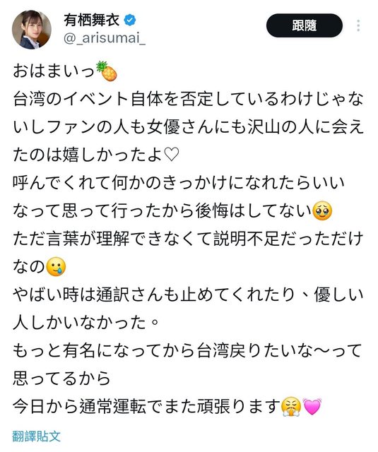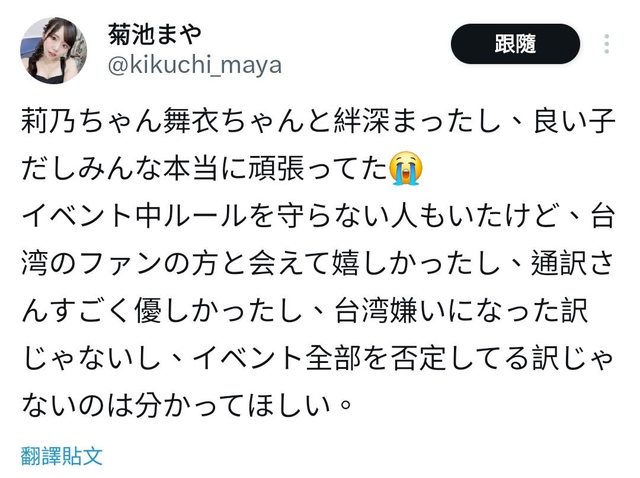 她是說有人找她,覺得是個機會沒考慮太多就答應了 只是有些是言語無法說明清楚的東西,並沒有要否定整個TAE的活動 也有提到有些粉絲太過分到要翻譯出手制止的程度 想變得更出名再回到台灣,會更努力工作。 菊池的部分 https://i.imgur.com/yyapAYn.jpeg
