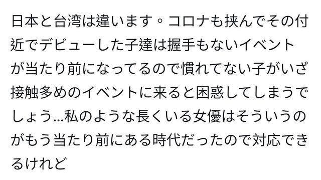 大意是說,在COVID-19時期出道的女優,辦活動大概是連握手都沒有的程度 一下子來TAE這個身體接觸這麼激烈的場子,當然會很不習慣而且很困惑 如果是像我一樣身經百戰的老鳥(永井瑪麗亞:還有我),是可以輕鬆應付的。 菊池、酒井跟有栖的確是在這個時期出道的,佐野櫻桃出道8年,瑪麗亞更久。 回到一番町的活動,其他大概都沒啥問題,會起爭議的是逆女女女 https://i.imgur.com/MeGHSlA.jpeg