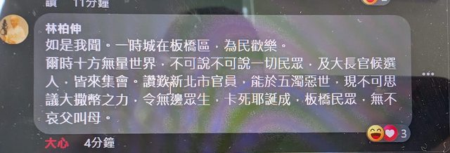 居民言:「侯市長!若以駕車相觀耶誕城者,整個板橋即是車陣。」侯友宜言:「市民!