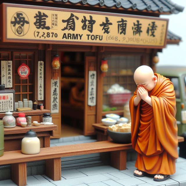 有一個和尚到市區裡辦公,路過一間退伍老兵開的豆腐店突然感動不已,他讚嘆:佛果然無所不在。