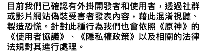 https://hoyo.link/80GCFBAL?q=21ICQzp3tsR 親愛的旅行者: 近期,開發團隊發現有個別旅行者使用外掛,竄改遊戲資料惡意破壞其他旅行者的遊戲體驗。具體情況:在多人遊戲模式下,使用外掛消除其他旅行者大世界中的物件,導致其他旅行者無法正常遊玩。 此問題已於8月25日修復,開發團隊亦於8月26日為遇到此問題且有聯絡客服的旅行者修復遊戲帳號,並透過客服告知旅行者修復狀態。在問題修復後,我們也在持續注意此問題。現在,多人遊戲模式的體驗正常,旅行者可以正常進行多人遊戲。 *目前,有極少數帳號可能還有少量物件尚未恢復的情況,此情況不會影響旅行者的正常遊戲體驗。開發團隊將會在後續版本將之徹底恢復,屆時會透過信件告知受影響的旅行者。 若旅行者在近期遇到類似問題,可以透過客服向我們回報,並附上物件的具體位置。一旦確認為類似外掛導致的問題,客服會盡快與旅行者聯絡。 此外,旅行者如果有遇到其他問題,或是發現任何使用外掛、第三方工具的違規行為,也可以聯絡官方客服(回報違規行為時,請附上違規者的UID、檢舉原因等相關資訊),將有助於開發團隊更好地定位並修復問題。 此類使用外掛,竄改資料消除其他旅行者大世界中物件的行為,已嚴重影響旅行者的遊玩體驗。為維護遊戲公平,並保障各位旅行者的權益,開發團隊已將使用此類外掛的帳號封鎖,並將向此類外掛的製作者、使用者,以及傳播者追究法律責任。 目前我們已確認有外掛開發者和使用者,透過社群或影片網站偽裝受害者發表內容,藉此混淆視聽、製造恐慌。針對此種行為我們也會依照《原神》的《使用者協議》、《隱私權政策》以及相關的法律法規對其進行處理。 感謝大家一路以來對《原神》的陪伴與支持,我們一直致力於維護公平、健康的遊戲環境,並嚴禁任何透過不正當方式危害遊戲公平的行為。同時,開發團隊在此聲明:遊戲的任何漏洞,與遊戲內的玩法設計、劇情、人物均無關係,請勿透過無端想像破壞其他旅行者的體驗。希望各位旅行者可以一同抵制外掛、第三方工具等不良行為,維護公平友好的遊戲環境。 -- Cubum autem in duos cubos, aut quadratoquadratum in duos quadratoquadratos, et generaliter nullam in infinitum ultra quadratum potestatem in duos eiusdem nominis fas est dividere cuius rei demonstrationem mirabilem sane detexi. Hanc marginis exiguitas non caperet. -- ※ 發信站: 批踢踢實業坊(pttbestweb.org.tw), 來自: 114.137.124.139 (臺灣) ※ 文章網址: https://pttbestweb.org.tw/miHoYo/M.1693219184.A.28F