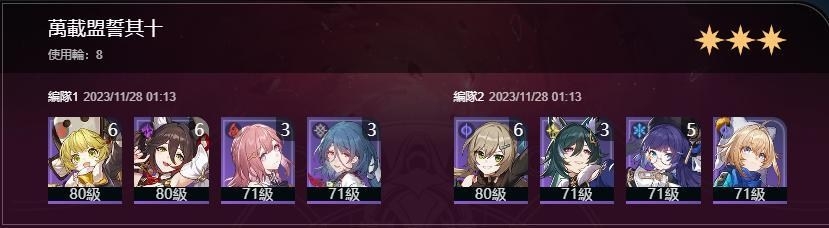 : 上半:羅剎(0+0),飲月(0+0),鴨(1+1),素裳(滿命+希兒的光錐)