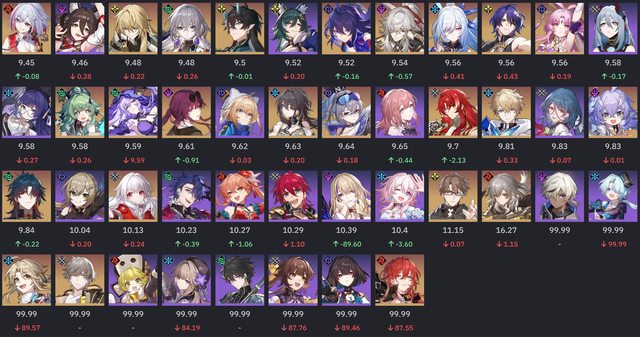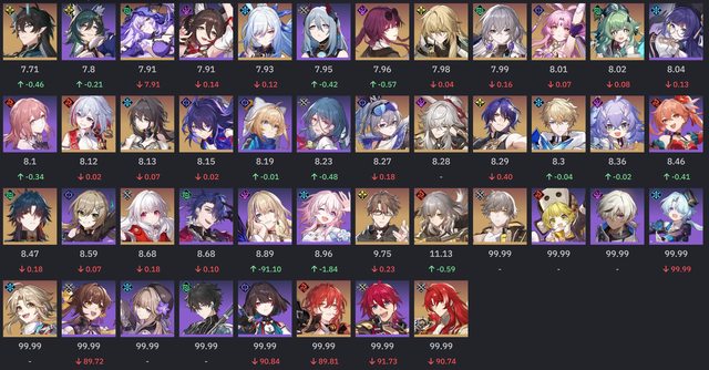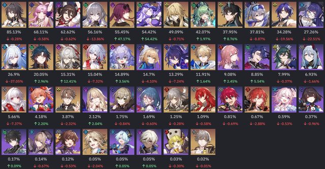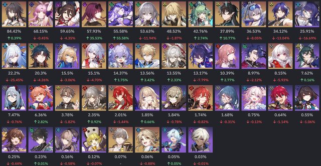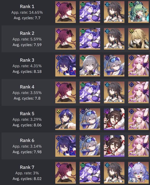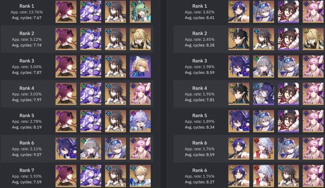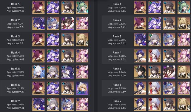 有幾個點要特別說明,詢問過原作者, 統計至少要5+筆有效樣本才會納入, 由於有星魂的限定腳色會被剔除輪數統計, 所以會出現幾個弔詭的現象是輪數變為99.99 原作者表示看到99.99就是樣本不夠多的意思 不意外的DoT電母風婆直接起飛,衝到除輔助外的前兩名 阮梅依舊屹立不搖的佔據第一, 景元在12層也因終於迎來了弱點環境增加了12% (終於超過了希兒...) 鏡流則是沒了冰弱點後跌得最多,但仍然有26% 比較奇怪的是真理+托帕兩人打12層下半應該是非常好打的組合。 但是兩人的登場率都是下降,可托帕又拿下平均輪數第一,詭異。 隊伍方面一掃以前的量子戰艦與鏡流冰隊洗版的的現象 DoT成為最熱門的隊伍,阮卡黑三人組是斷崖式領先 真有這麼多人抽嗎? 剩不到5人在玩姬子彥卿了QQ -- 俗話說的好,時間磨平了我們的稜角。 我們都從形形色色的人... 變成了色色的人... https://i.imgur.com/r7ZwLDF.png