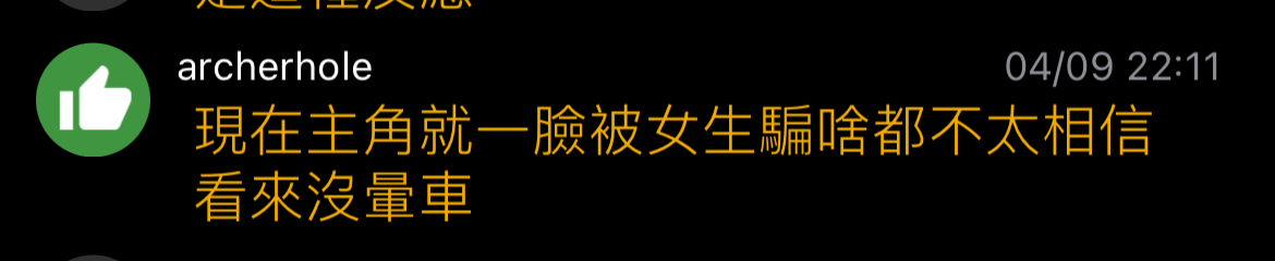 推 archerhole: 現在主角就一臉被女生騙啥都不太相信 看來沒暈車 04/09 22:11