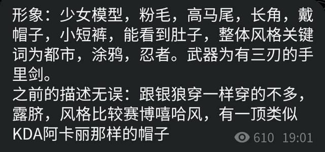 跟銀狼穿一樣穿的不多,露臍,風格比較賽博嘻哈風,有一頂類似KD