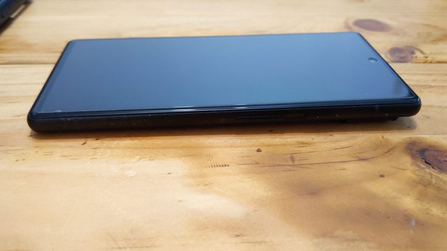 現行的保護貼有裂痕,不過還附上一張備用的、現行保護殼是犀牛盾,另有一個備用的殼