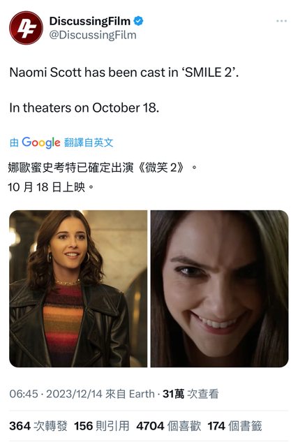 推 nanalove45 : 以為她要往音樂發展了,沒想到還會回來演電影12/15 12:42