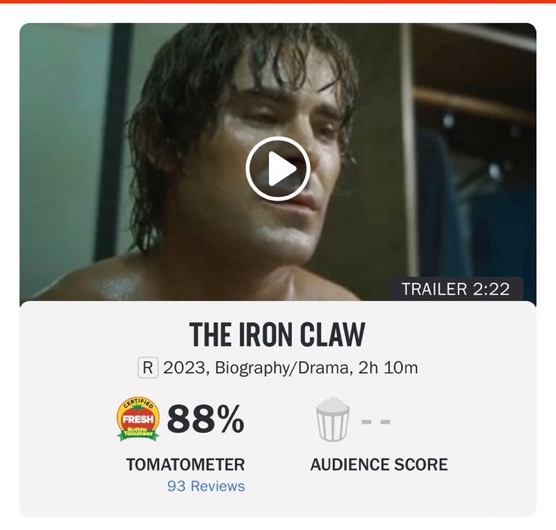 https://www.rottentomatoes.com/m/the_iron_claw_2023 143個評分已經達到認證標準 A24出品,真人真事改編,查克艾福隆主演 主角是一個傳奇摔角世家 想當年的歌舞青春奶油小生,現在也是一條硬漢了 -- ※ 發信站: 批踢踢實業坊(pttbestweb.org.tw), 來自: 219.91.32.112 (臺灣) ※ 文章網址: https://pttbestweb.org.tw/movie/M.1703363291.A.AD1