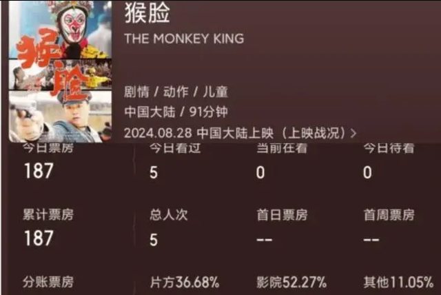 最慘的一部是電影《猴臉》,於28日首映當天的票房僅187元(人民幣約