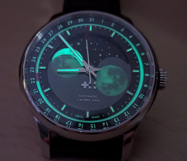 時標、日期面盤加上月相本身就有三層(陰影、月球及星空),諸多的層次讓整個面盤更