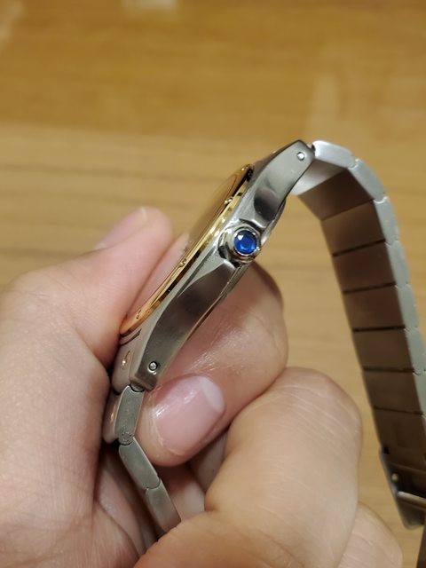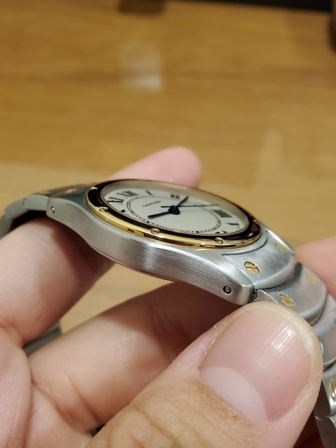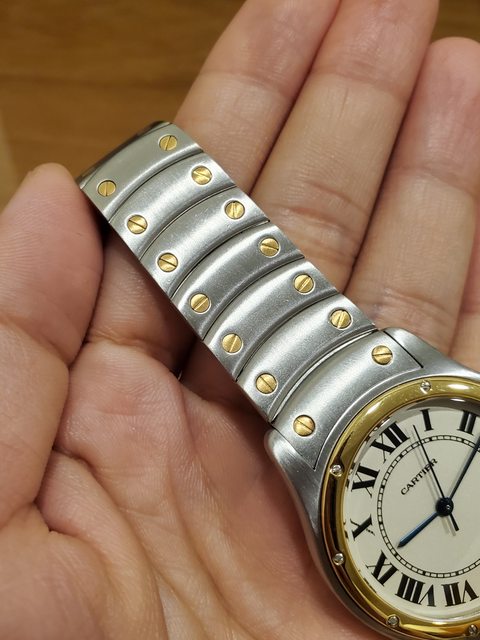 面半金Santos Ronde,整體錶況十分良好,無太多刮痕,錶殼鍊帶的拉絲都精緻清晰,半