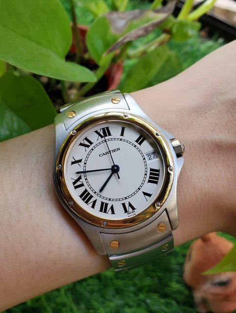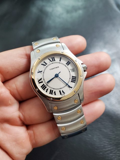 os和較少人知的其他形狀錶面Santos身價也跟著水漲船高。這支是難得品項很棒的圓型錶