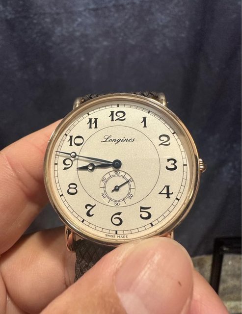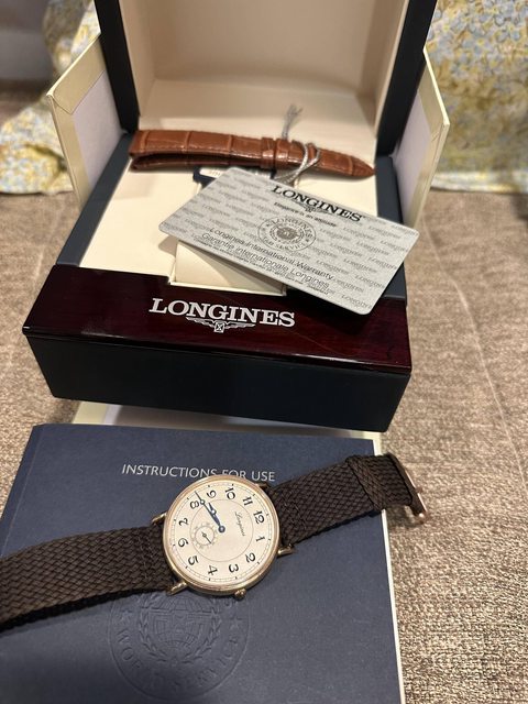 錶況:浪琴正18k玫瑰金錶,錶徑38.5mm藍鋼指針,印刷面及獨有數字。9成新,盒單配件全