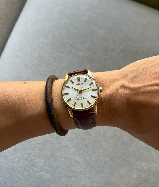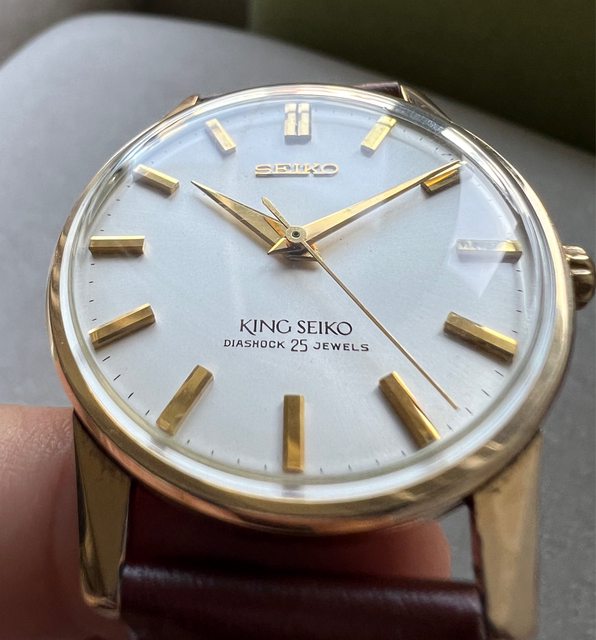 1. 初代King Seiko 後期版本,有停秒功能,面盤漂亮,立體時標經典劍針,外殼14k厚