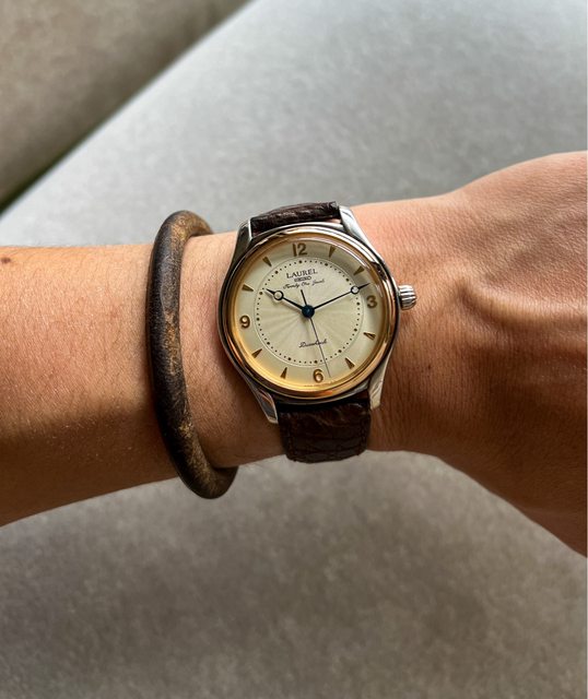 1. Seiko Laurel 4s 手上鍊銀錶殼,925銀錶殼18K錶圈,面盤中心為波紋紋路,搭上藍