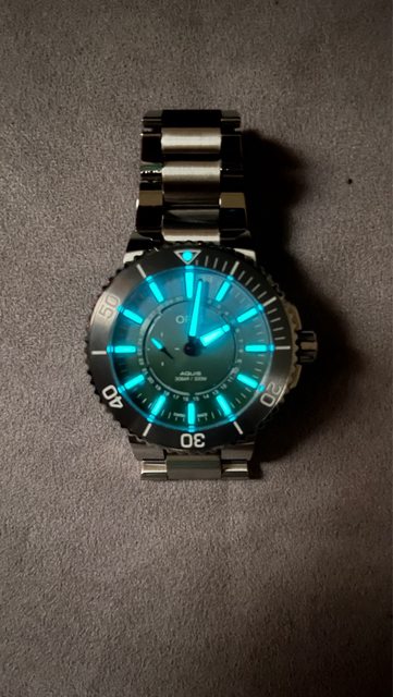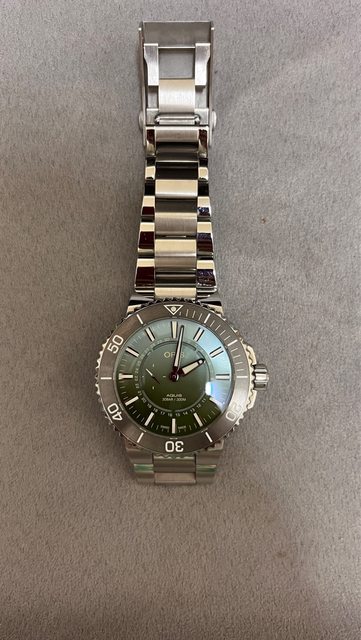 Oris瓦登海二代作品,特殊綠白色漸層面盤,搭配環狀日期顯示及夜光小秒針,非常特別