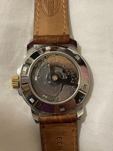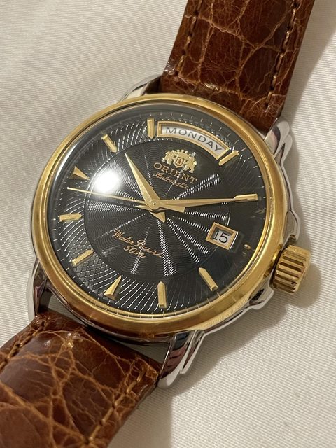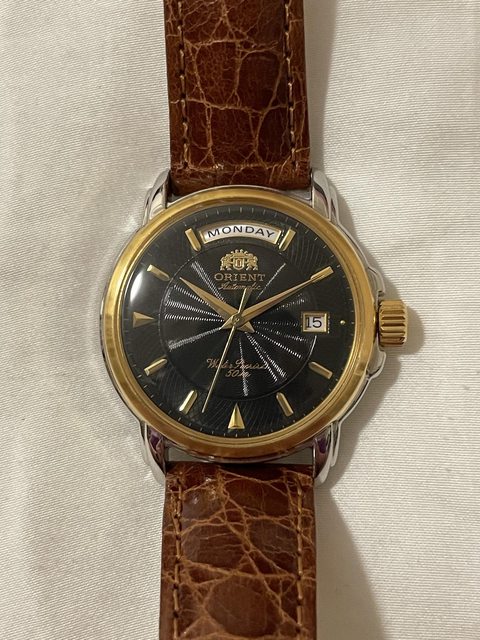 —————————————————— 2. 東方 orient day-date 錶徑約34mm 自動機芯/無手動上鏈 有日期快調,無停秒/星期快調 壓克力鏡面,購買時已有使用痕跡 此款相對平常看到的東方DD算是少見 含原廠扣,欲售3000含運