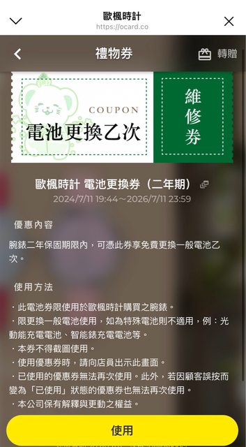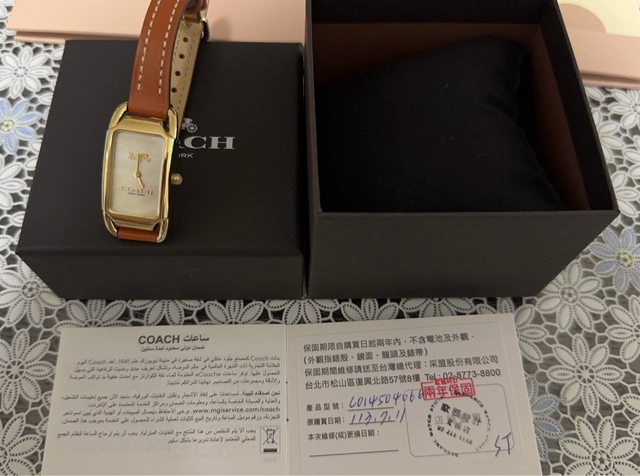 隨附物件:包裝盒、保卡、COACH紙袋、歐楓時計電池更換1次券